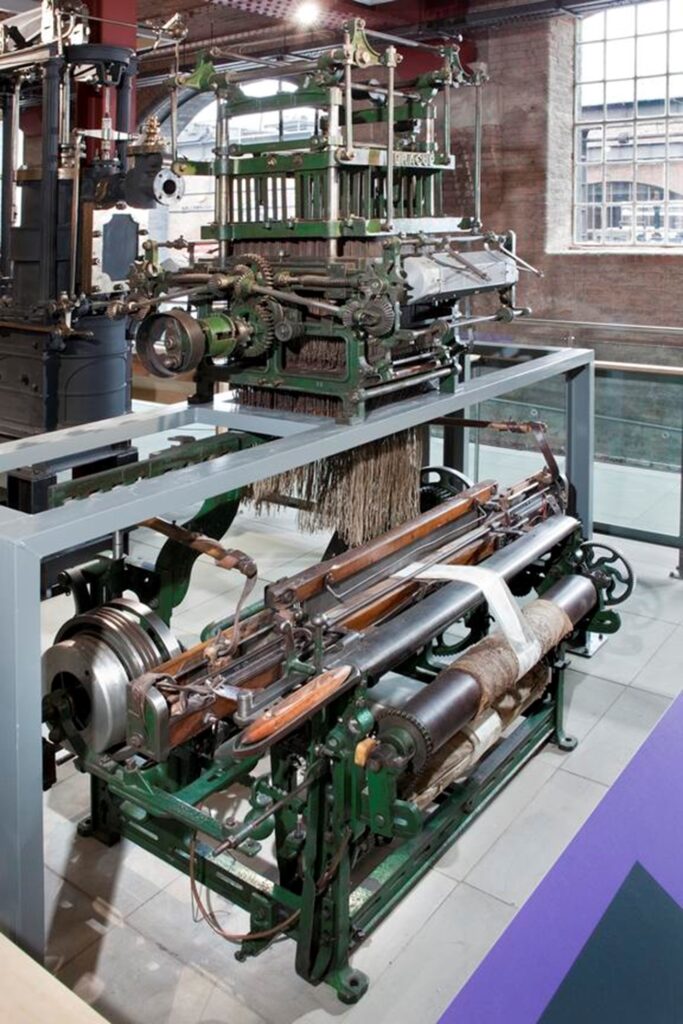 The earliest successful machine that could mass produce patterned fabric was the Jacquard Loom, developed around 1800 by Joseph Marie Jacquard. By using a mechanical chain of cards with holes punched in them to control which threads were included in the weave, the Jacquard Loom could quickly produce patterned cloth. Different decks of punched cards could be used to print different patterns. Today’s Christmas jumper knitting machines are computerised, but they owe a historic debt to the Jacquard Loom.