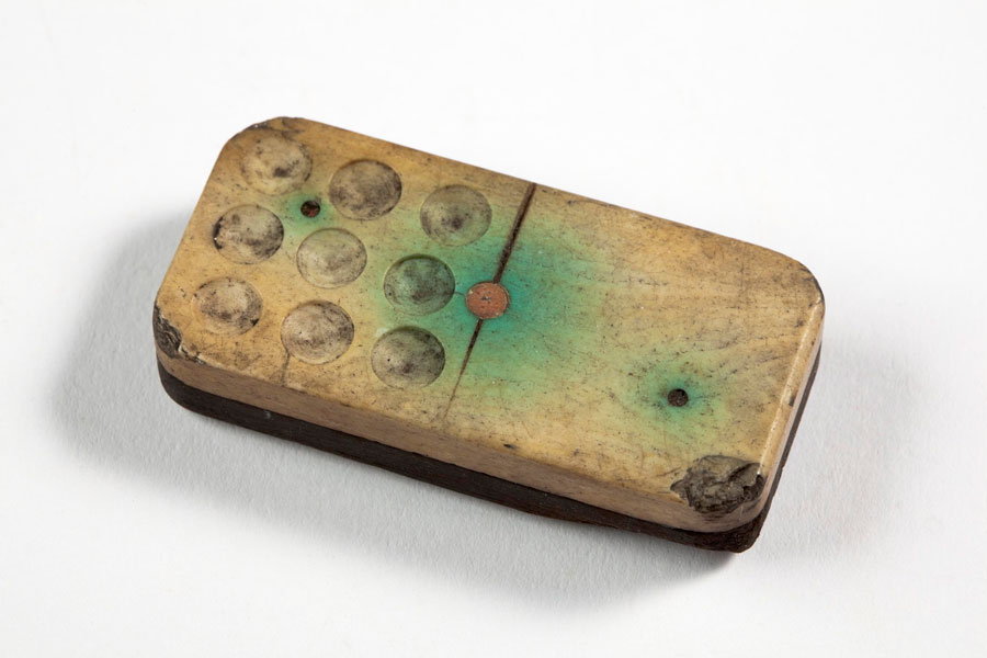 Archaeologists excavating 19th-century workers’ housing on Loom Street in Ancoats found this wood and bone domino, perhaps used in games by long-gone Ancoats dwellers. Many of the people who flocked to Manchester for work settled in Ancoats, where densely packed streets of workers’ cottages sat alongside towering cotton mills.