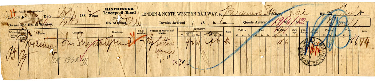 Recently, we received an interesting item through the post that tells us something about the transit of goods through Liverpool Road Station in the 1880s.