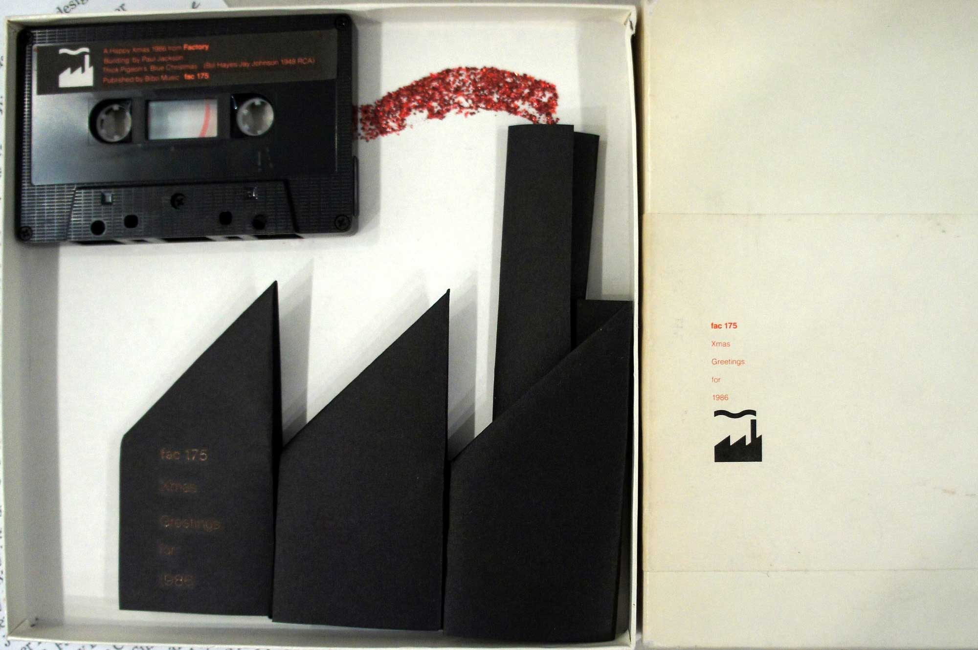 The next two Christmas cards, from 1985 and 1986, featured the Factory Records logo. FAC 145 was a cardboard ‘CD’ in a sleeve that featured the logo alongside a molecular design representing snow. FAC 175 was a combined Christmas card and gift, featuring an origami logo in black textured paper with red thermographic printing placed inside a box, and the smoke from the factory chimney rendered in red glitter. Alongside the card was a cassette containing a recording of Blue Christmas by Thick Pigeon. This is one of my favourite items in the Science and Industry Museum’s Jon Savage archive.