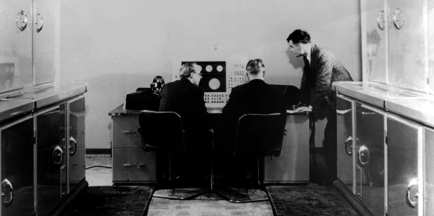 (Alan Turing and colleagues working on the Ferranti Mark I computer, which was based on the Manchester Mark I developed by the University of Manchester)