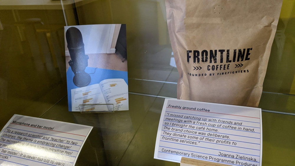 From coffee beans to recreate Joanna’s coffee shop habit at home, and the straw hat that kept Dani protected outdoors while furloughed, they capture a whole range of experiences. Ling’s microphone and bar model represent having to juggle working and home schooling, while Leonie’s baking powder symbolises a new way of communicating science via home experiments on Twitter.