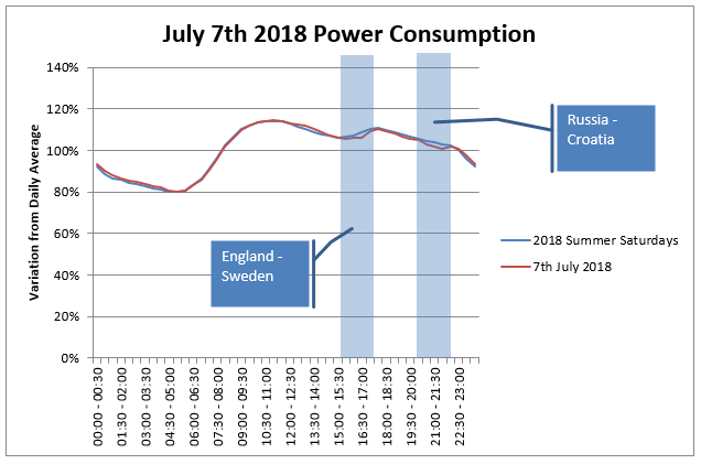 Its hard to say exactly, but to speculate, perhaps people were crowded round TVs watching the games rather than doing other things. TVs, along with most household appliances, have got far more efficient over recent years (which explains why overall electricity demand is currently falling), and perhaps rather than putting the kettle on, people went for the beers in the fridge as it was warm in the UK at the time. Either way, given the scale of the event, the effect is fairly small, only 2–3% of the average load across the day.