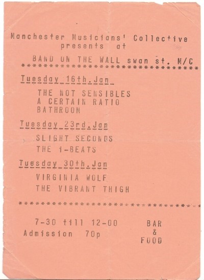 By the late 1970s, Band on the Wall had a less perilous stage and had become the weekly home for the Manchester Musicians’ Collective. The collective included three bands who released music on Factory Records: Joy Division, A Certain Ratio and Crispy Ambulance. Martin Moscrop was a member of A Certain Ratio and Swamp Children. He recalls that membership of the collective was decided at a monthly meeting, and whichever bands were ‘in’ were given twice monthly gigs. Running order for the gigs was decided each Monday at the weekly meeting.