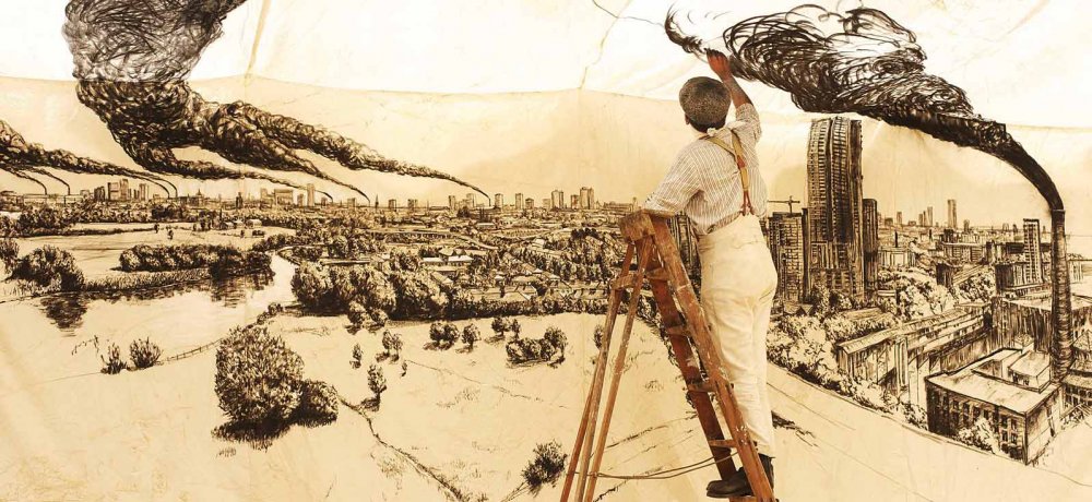 I saw his previous work here in Manchester, Coal on Cotton. That was a 65-hour performance that took place in a half-built gallery at the Whitworth during its renovation in 2013. During the performance, he silently metamorphosed from a simple farmer who single-handedly raised a cotton tent in the gallery into a Victorian mill worker who drew an intricate, detailed landscape, and lastly into a charismatic titan of industry who ordered his team of workers to take down the tent and then to hoist the finished drawing onto the front of the building.