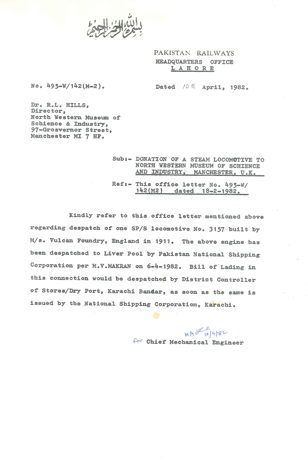 The news left Dr Hills with little time to arrange shipment of the locomotive back to Manchester in time for an important event. The original idea had been to use a ship that was able to travel up the Manchester Ship Canal to the Docks in Manchester; however, because of the delay in getting the locomotive, the only ship that would fit through the locks was no longer available. After some more discussions with other shipping companies, the Pakistan National Shipping Corporation agreed to transport the locomotive back to Liverpool Docks, for no charge, on board the MV Makran, which set sail on 6 April 1982. As the MV Makran made its way to Liverpool, Dr Hills had to organise the discharging of SP/S 3157 at the docks and after some further contacting of people and organisations, SP/S 3157 was almost home.