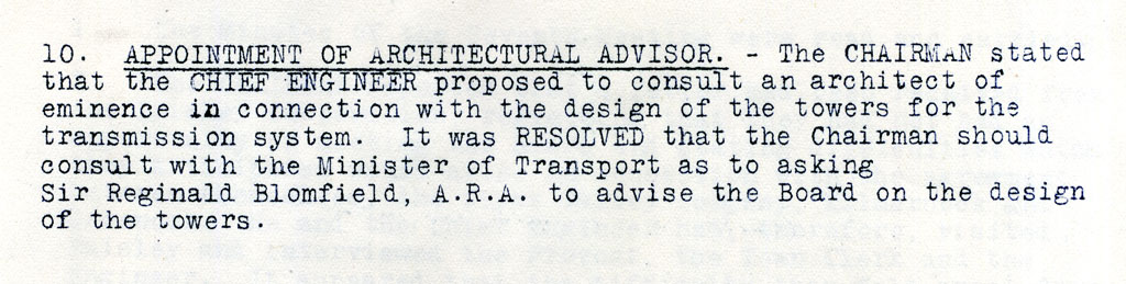 Blomfield’s appointment as a consultant to the CEB was an attempt to reassure the public that new technology, large-scale standardisation, and a new public authority could be made acceptable. His immediate task was to recommend a standard tower design which could carry the 132,000 volt power lines across the country with minimal visual disturbance.