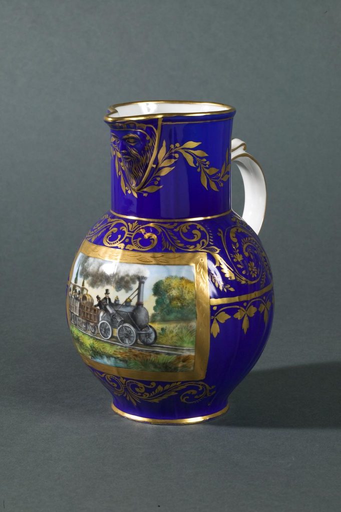 This detailed blue and gold jug has a lovely image of Rocket zipping through the countryside in full steam, and was made approx. 1885. We don’t hold a huge amount of information on this object, but it’s in surprisingly good condition.