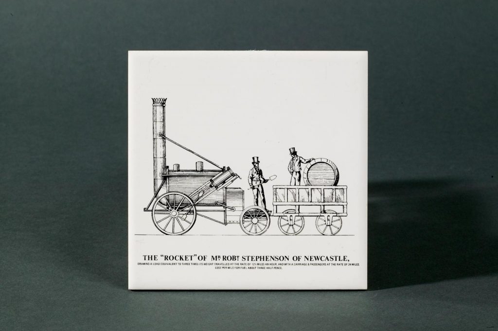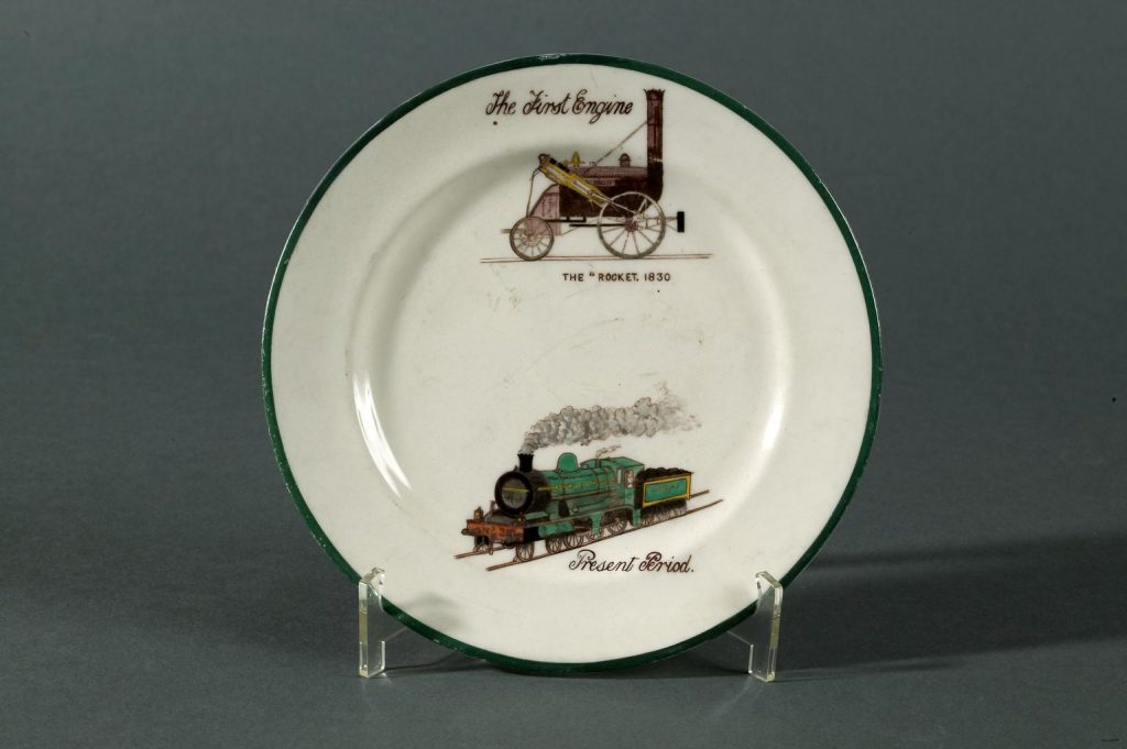 Another one of our objects that we don’t know much about, this fetching plate was made in 1910 and features an intricately drawn image of Rocket in comparison with one of the modern day locos.