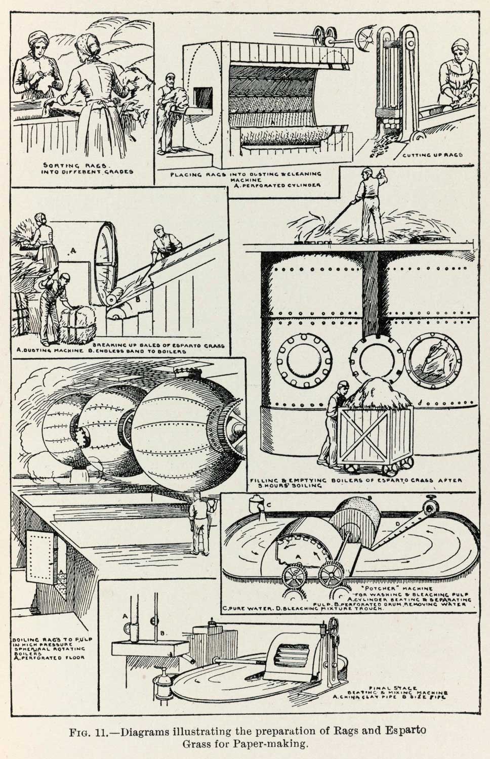 Old textiles have also been recycled into other products. For thousands of years, paper was made by pulping old cotton and linen rags and drying a thin layer of this pulp to make individual sheets of paper. The rags often came from old underwear; can you imagine reading a book made from old pants? The demand for paper meant that rags commanded a good price and their collection could supplement a household’s income and even become a job, such as a rag and bone man. The recycling of rags into paper continued to be important until the 1870s, when wood pulp began to replace rags in paper manufacture.