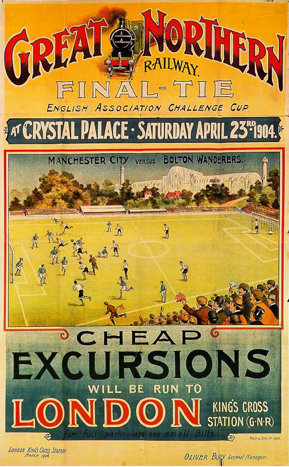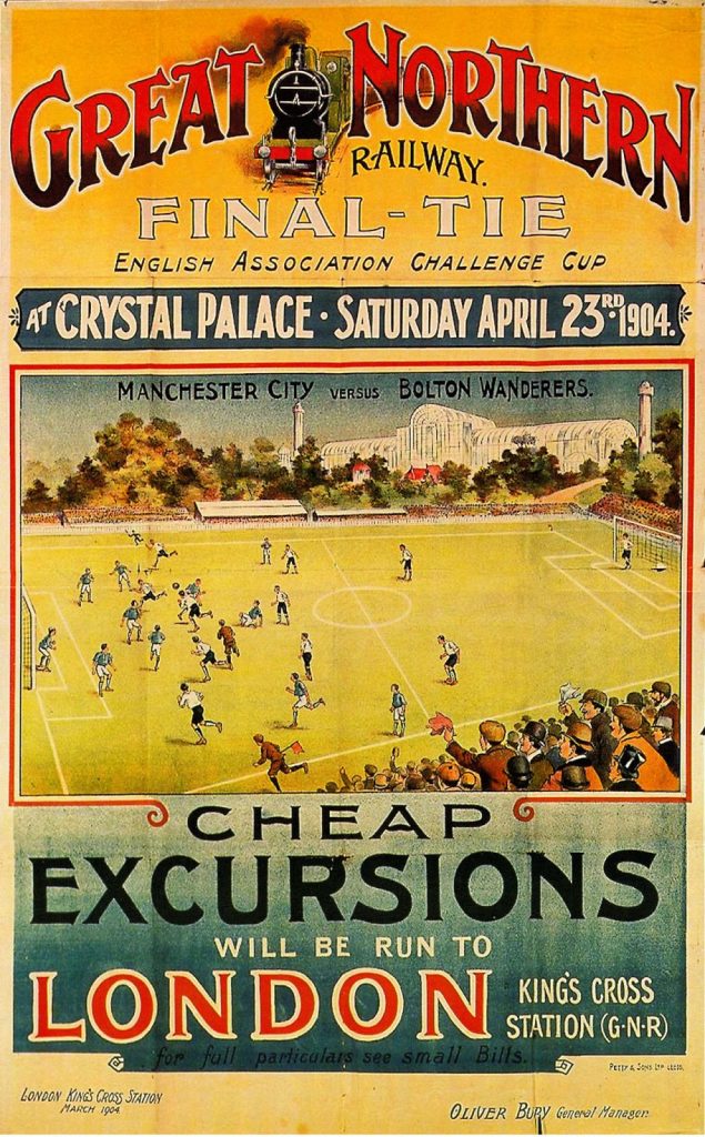 In 1904 Manchester City reached their first FA Cup final. Some 100 special trains brought some 40,000 northern fans to join some 20,000 from across London and the south of England at the Crystal Palace ground where they saw City beat Bolton Wanderers 1-0.