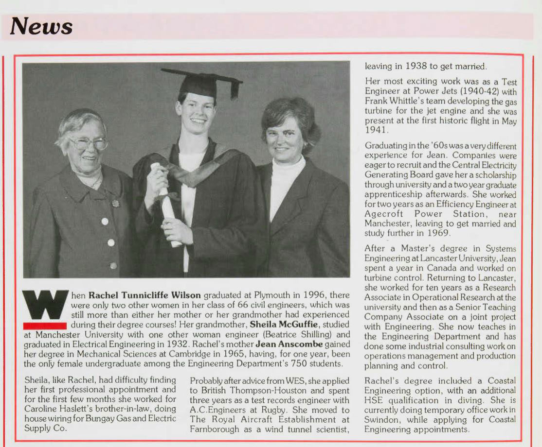 The journal was happy to report, for example, that Sheila McGuffie had completed her Bachelor’s degree in electrical engineering at Victoria University in 1932, as one of only two women in the department. After a series of regular reports on her career in aviation engineering, she appeared again alongside her daughter and granddaughter in a 1997 issue, both of whom had gone on to gain degrees in engineering. Gertrude Entwisle’s exploits had been similarly well-documented; from joining the Society at its formation in 1919, to serving as its President in 1941–43, to her eventual retirement from Metropolitan-Vickers as the first woman in Great Britain to have a complete career in engineering, every milestone was celebrated.