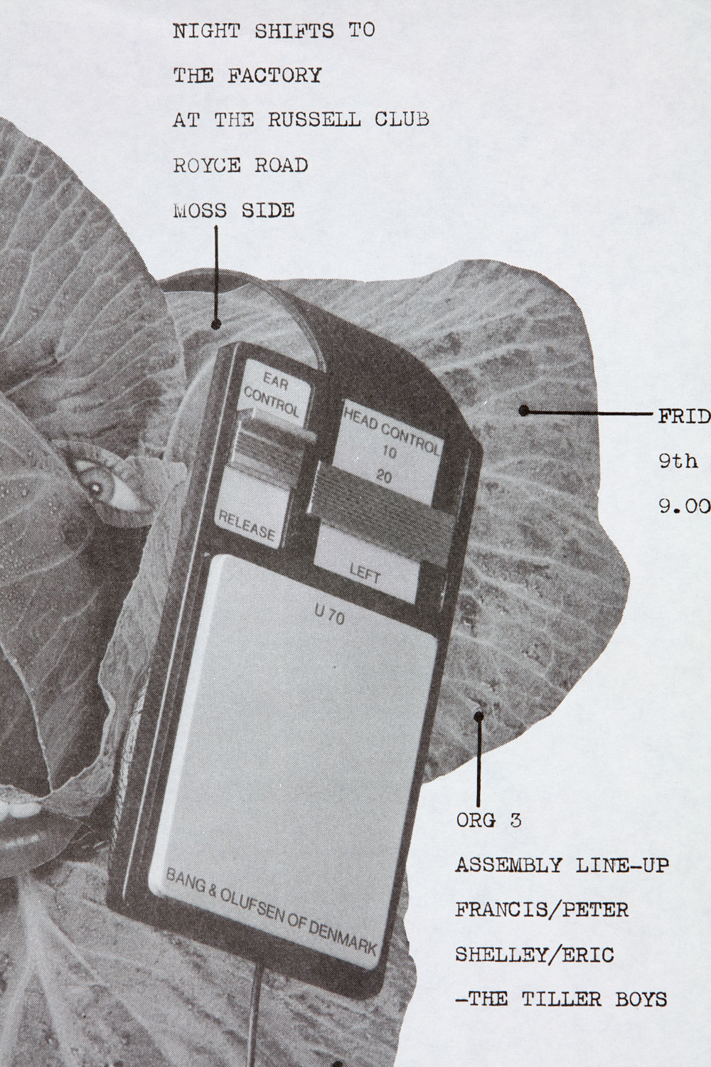 Someone who never worked for Factory, but who was an influence on the early cut-and-paste photomontage style of the flyers and newsletters publicising Factory’s existence, was the artist Linder. Linder had a loose connection to Factory Records through Peter Saville, who was a fellow art student at Manchester Polytechnic. Linder produced flyers for early Factory gigs at the Russell Club in Hulme, before designing a menstrual egg timer catalogued as FAC 8 in the official Factory catalogue and having her band Ludus featured in a short film for FAC 9 The Factory Flick.